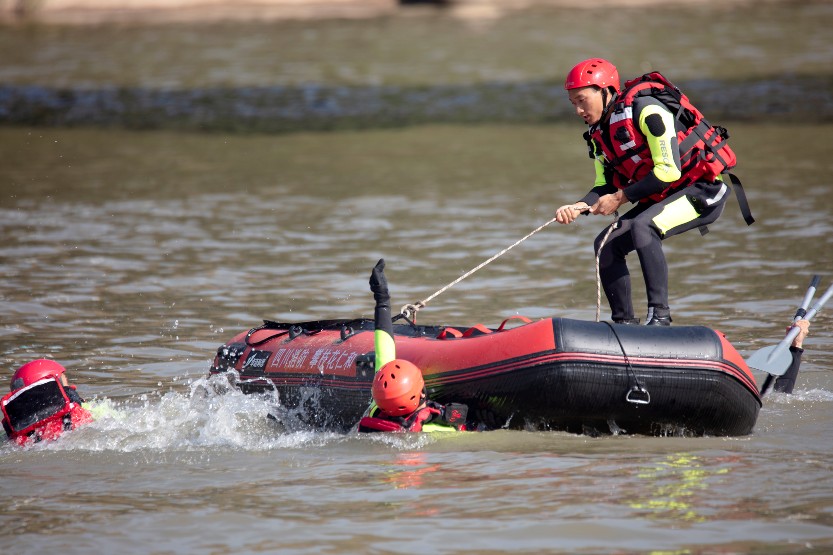 当天的演练假设2022年4月26日米易县突发暴雨,持续时间超过20小时,局部地区6小时降雨量高达300毫米,造成米易县3个地区受灾,受灾境线超过50公里,100余人被困,境内主要流域沿线受灾严重。辖区消防救援队伍首先响应,并向支队领导报告洪涝灾情,同时请求调派力量增援。消防救援支队迅速启动调度增援预案,全勤指挥部遂行出动,支队抗洪抢险突击队立即赶赴现场进行处置,全力开展救援。结合近年来抗洪抢险典型案例和消防救援队伍日常训练实际,现场各参演单位按照灾情设定开展了舟艇驾驶技能展示、舟艇离心力救援、舟艇翻舟自救、潜水救援、入水救援、绳索救援6个科目的展示,最大程度地贴近实战、还原真实救援现场。