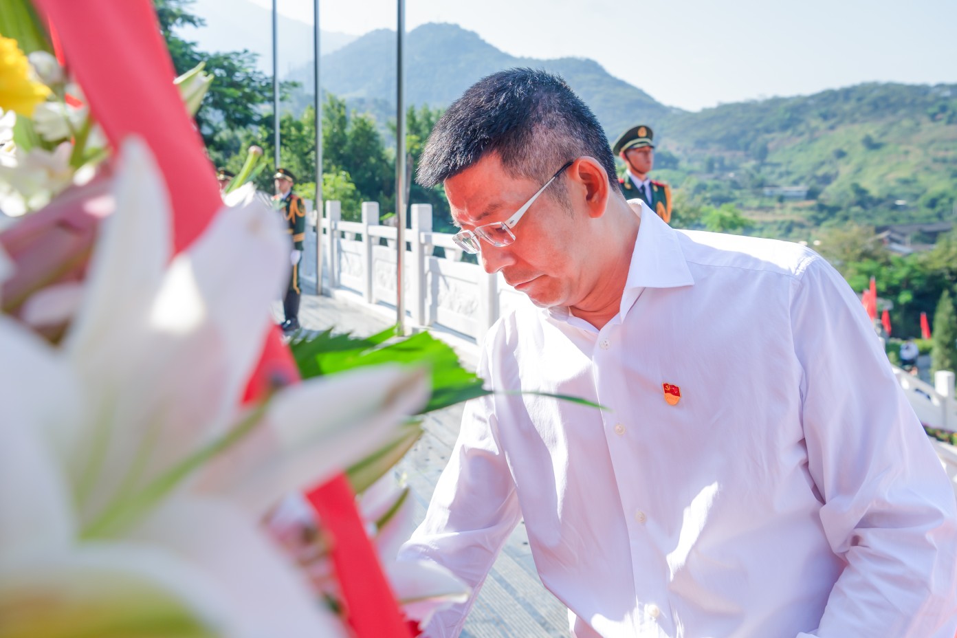 张正红神情肃穆缓步登上台阶,仔细整理花篮缎带,驻足凝视,表达对革命烈士最崇高的敬意。