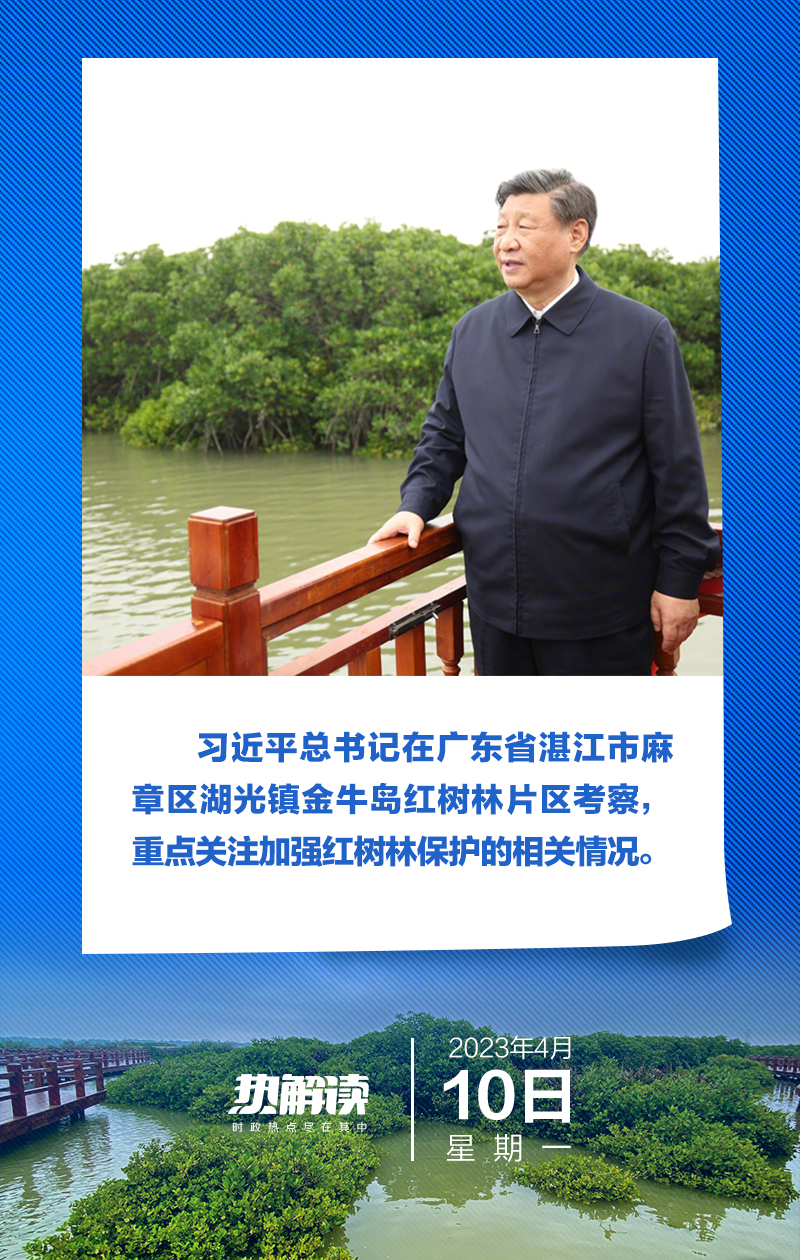 热解读近日,习近平总书记在广东考察,这是2023年全国两会后总书记首次地方考察。4月10日,总书记在有“红树林之城”美誉的湛江考察了麻章区湖光镇金牛岛红树林片区。