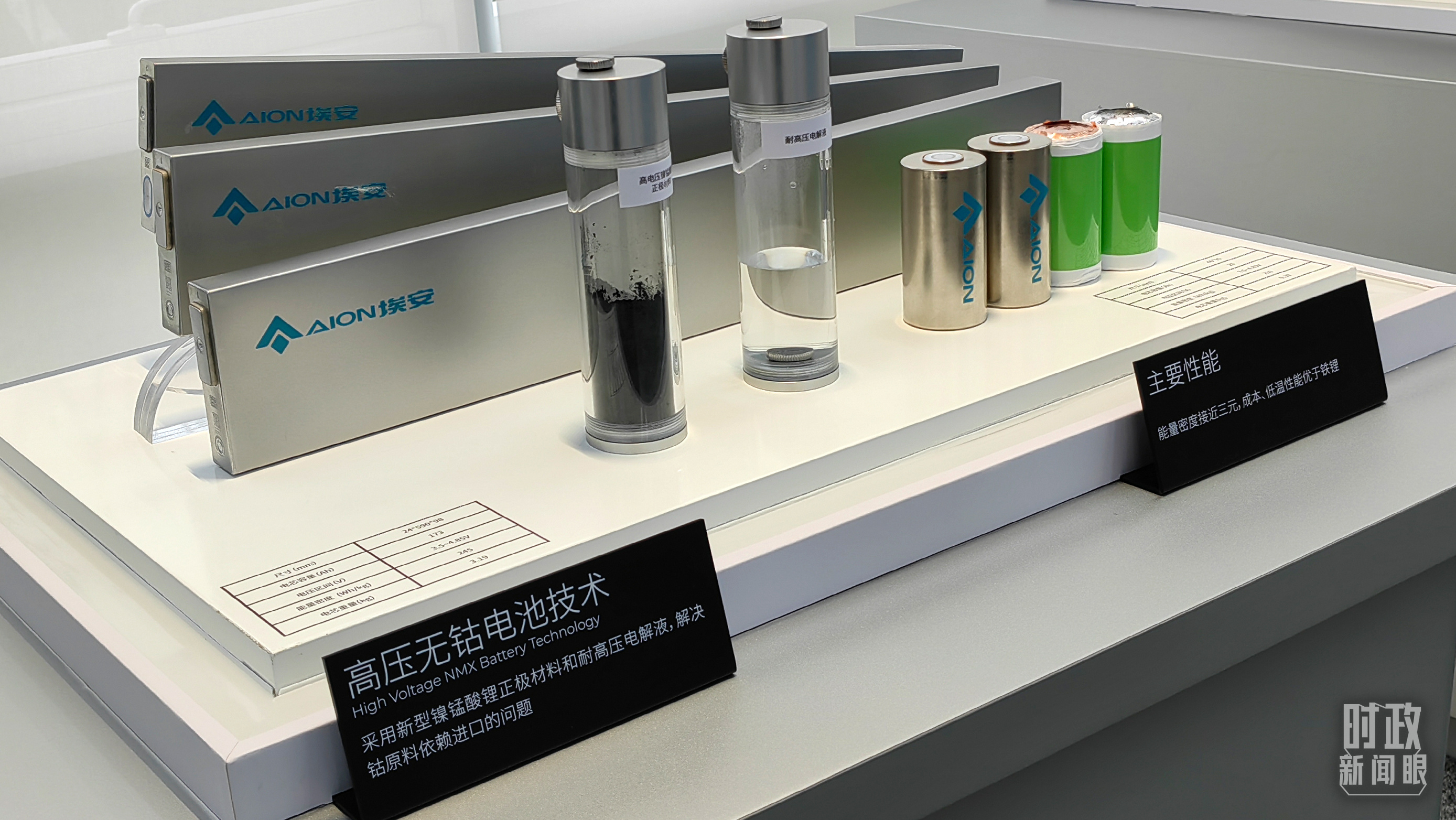 △广汽埃安展示的高压无钴电池技术,采用新型镍锰酸锂正极材料和耐高压电解液,解决了钴原料依赖进口的问题。(总台央视记者张晓鹏拍摄)