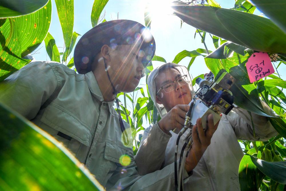 △2022年8月17日,在吉林梨树县,科技志愿者们在试验田里测量玉米光合作用。