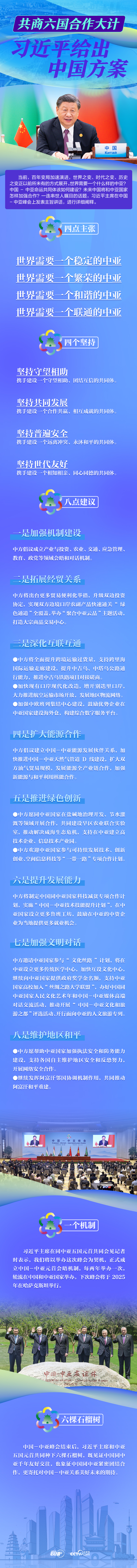 联播+“欢迎大家来到西安,出席中国-中亚峰会,共商中国同中亚五国合作大计。”5月19日,习近平主席在陕西省西安市主持首届中国-中亚峰会并发表题为《携手建设守望相助、共同发展、普遍安全、世代友好的中国-中亚命运共同体》的主旨讲话,同中亚五国元首签署了《中国-中亚峰会西安宣言》,并通过《中国-中亚峰会成果清单》。六国元首还共同会见记者、共同种下六棵石榴树。