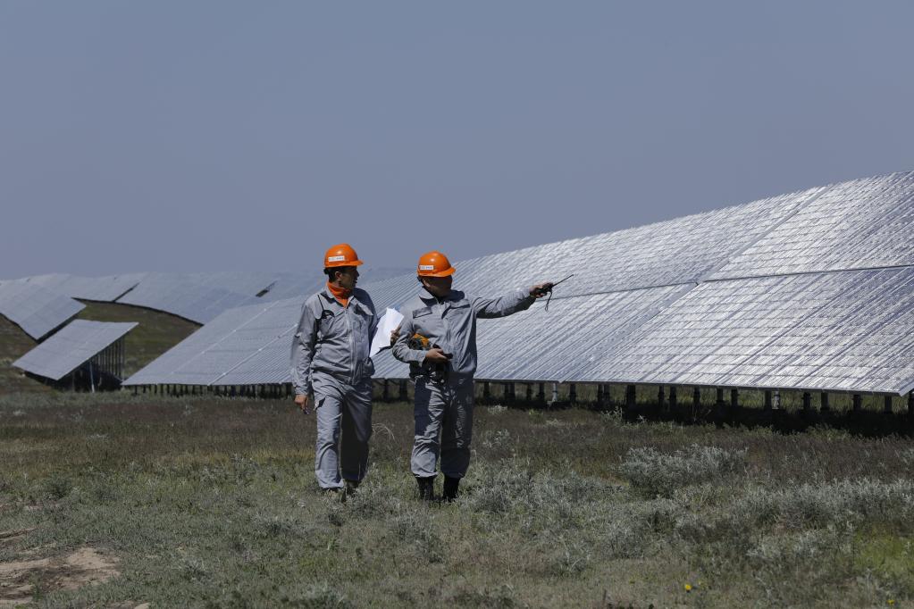 5月4日,在哈萨克斯坦阿拉木图州的卡普恰盖100兆瓦光伏电站内,工作人员监测太阳能电池方阵情况。(新华社发,奥斯帕诺夫摄)