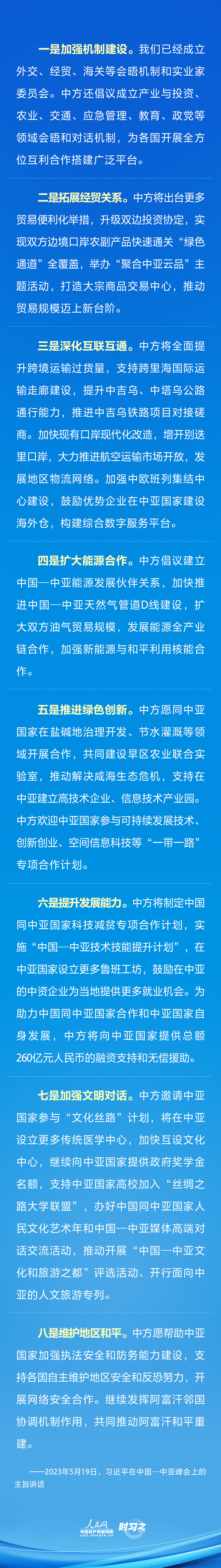 2023年5月19日上午,国家主席习近平在陕西省西安市主持首届中国—中亚峰会并发表题为《携手建设守望相助、共同发展、普遍安全、世代友好的中国—中亚命运共同体》的主旨讲话。就如何谱写中国同中亚国家关系新篇章,习近平提出八点倡议。