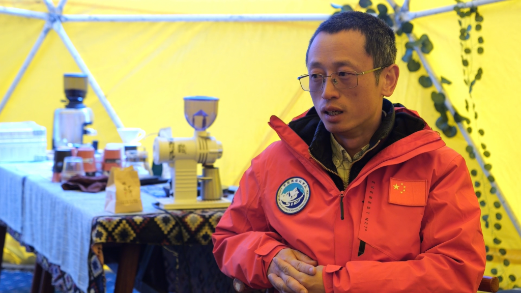 中国科学院西双版纳热带植物园的研究员苏涛在珠峰登山大本营接受新华社记者采访。