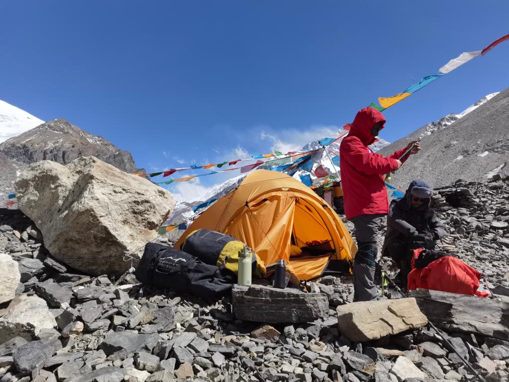 古生物科考分队在珠峰开展野外科学考察活动,研究员苏涛(左一)与队员在山中寻找避风处露营。采访对象供图。