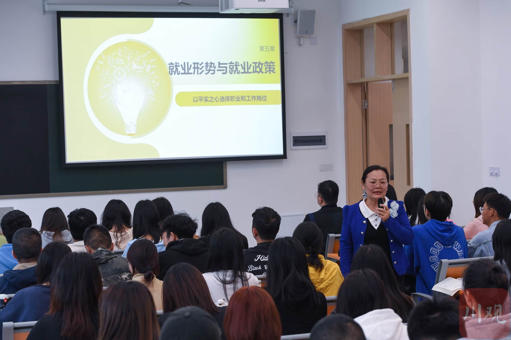 5月9日,宜宾学院临港校区经管学部专职辅导员童娟正在为学生上就业指导课程,深受学生喜爱。肖雨杨/摄