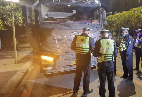 长春净月交警凌晨出击 整治大货车闯红灯违法行为