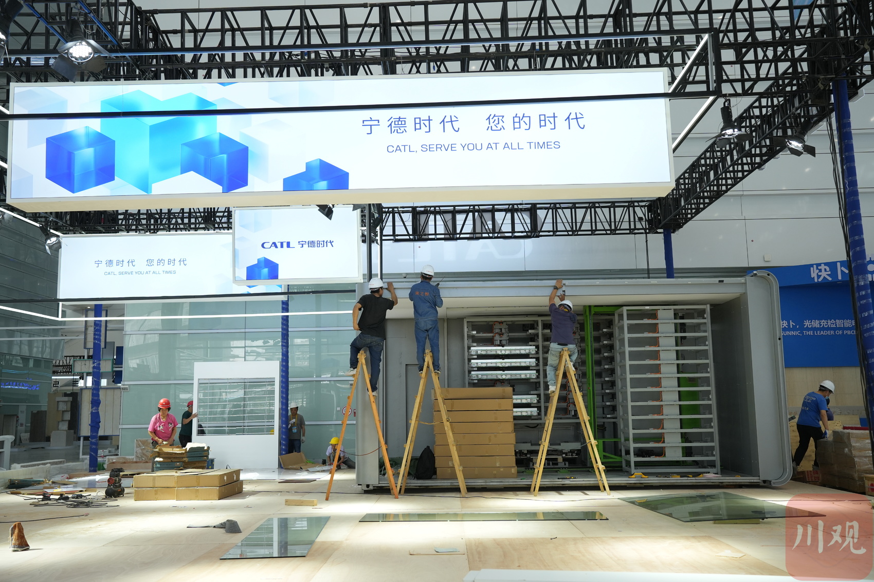 走进会展中心A区,记者一眼看到了主宾国匈牙利、欧阳明高院士工作站、宁德时代等展区的标识牌,施工人员们正紧锣密鼓地进行布展工作。同时,为了保障大会胜利召开,主会场也在有条不紊地开展集中排练。