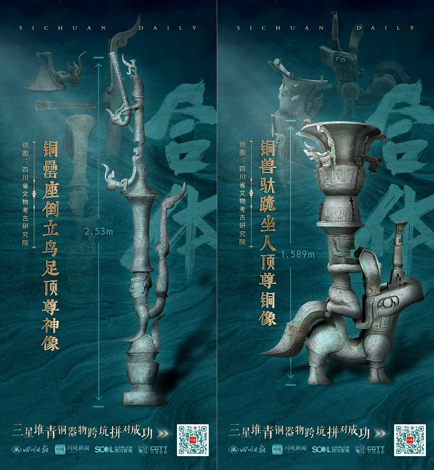 6月10日,文化和自然遗产日,四川省文物考古研究院再次公布了两件青铜器物跨坑拼对成功的消息。这两件文物分别是铜罍座倒立鸟足顶尊神像和铜兽驮跪坐人顶尊铜像,器物组成分别来自二号坑、三号坑以及八号坑。