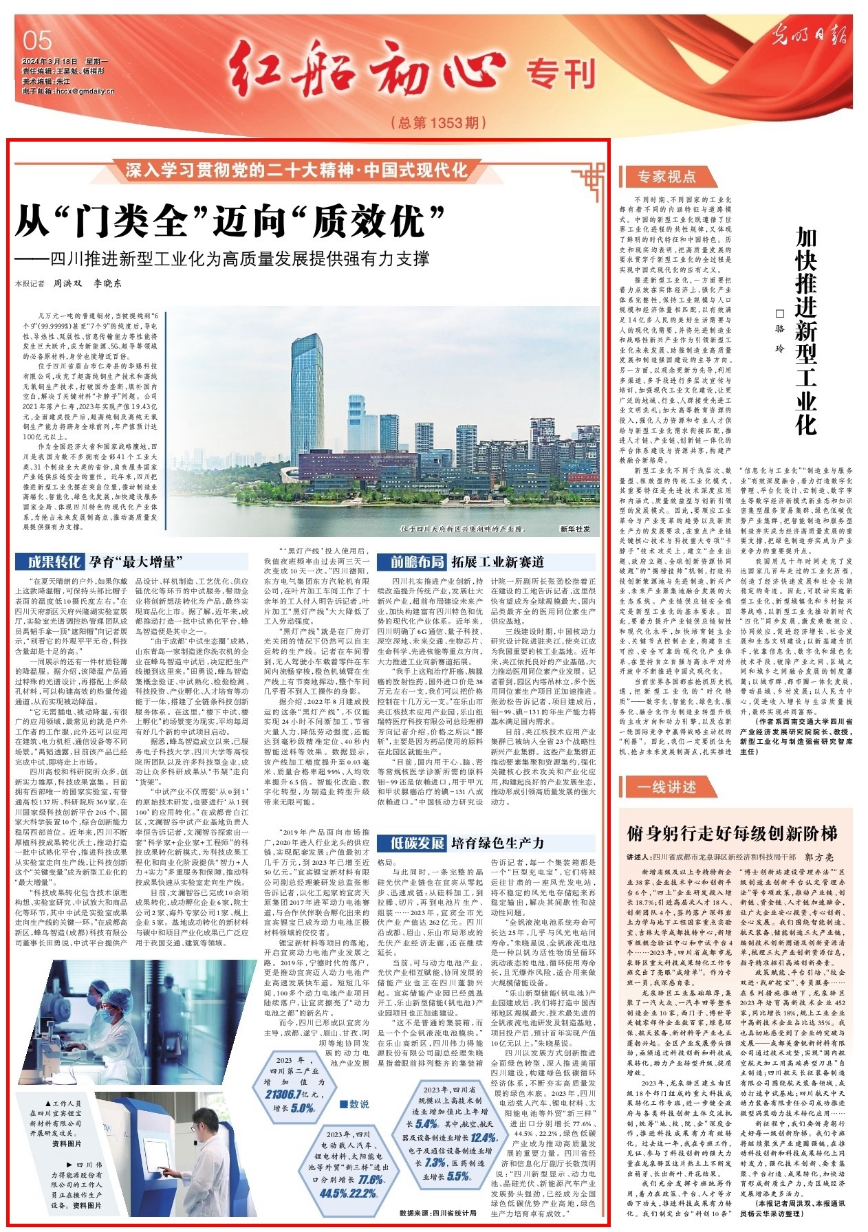 作为全国经济大省和国家战略腹地,四川是我国为数不多拥有全部41个工业大类、31个制造业大类的省份,肩负服务国家产业链供应链安全的重任。近年来,四川把推进新型工业化摆在突出位置,推动制造业高端化、智能化、绿色化发展,加快建设服务国家全局、体现四川特色的现代化产业体系,为抢占未来发展制高点、推动高质量发展提供强有力支撑。
