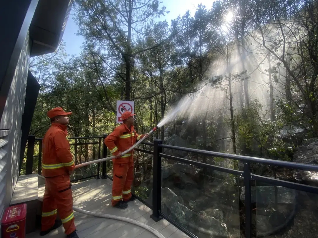 在阿署达星空露营地增湿现场,18名队员分成两组,取水带、拼接水带,水泵取水喷水增湿。“在天气持续干旱的情况下,我们已经把洒水增湿作为每日‘规定动作’。”东区银江镇专业扑火分队大队长廖文兵说,一节水带有30米长,可以加接到700余米,增湿作业区域主要在步道两侧约20米的山林区域。