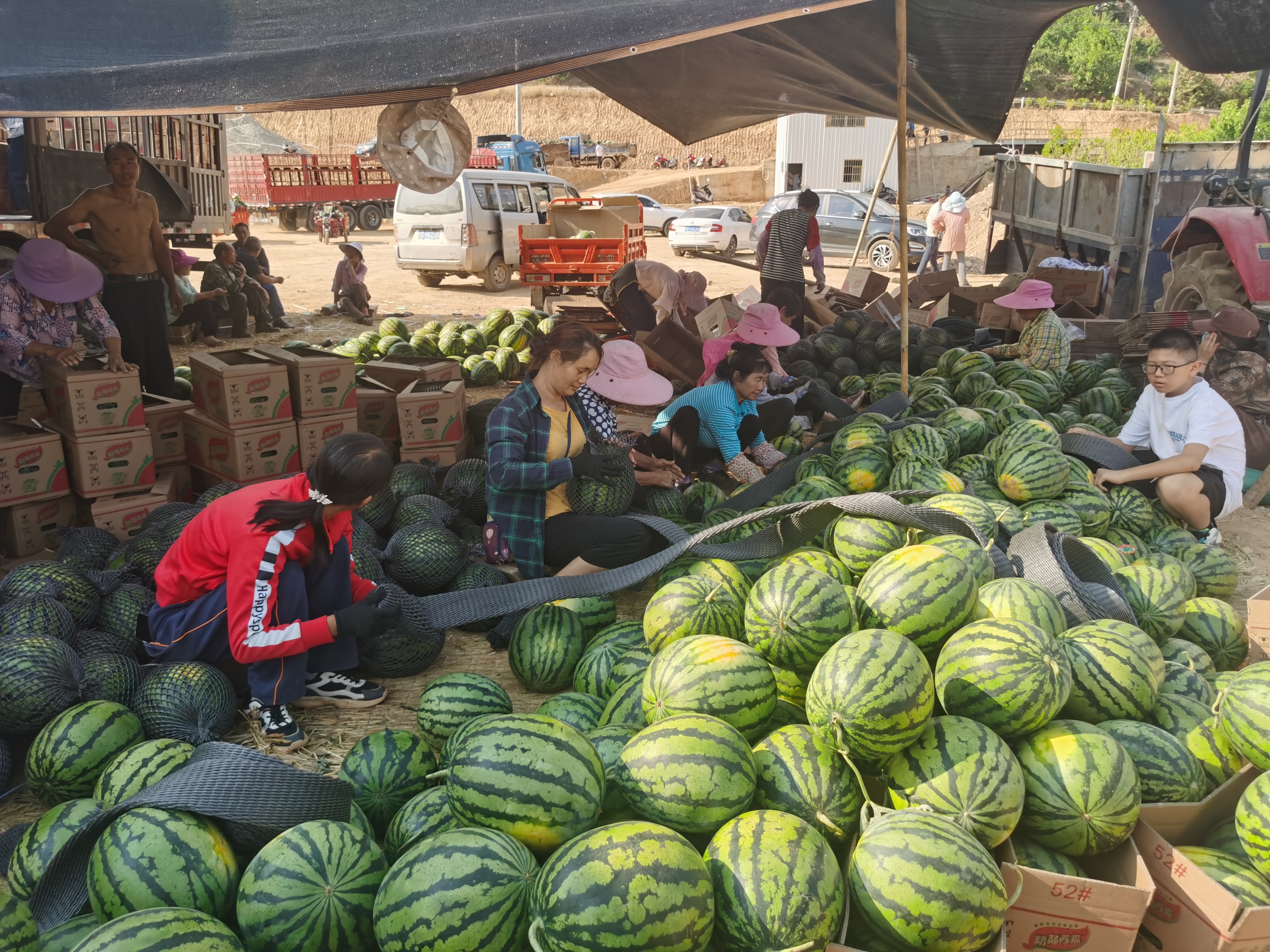 从4月末开始,盐边县北部惠民、永兴、国胜、渔门等乡镇的万亩西瓜全面进入成熟期,像赵延年一样,早已下了订单的山西、陕西、山东、辽宁、吉林、黑龙江、河北、天津的果商及货车司机们云集北部乡村,省道S221约70公里的盐边段,拉西瓜的大货车排成一字长龙。