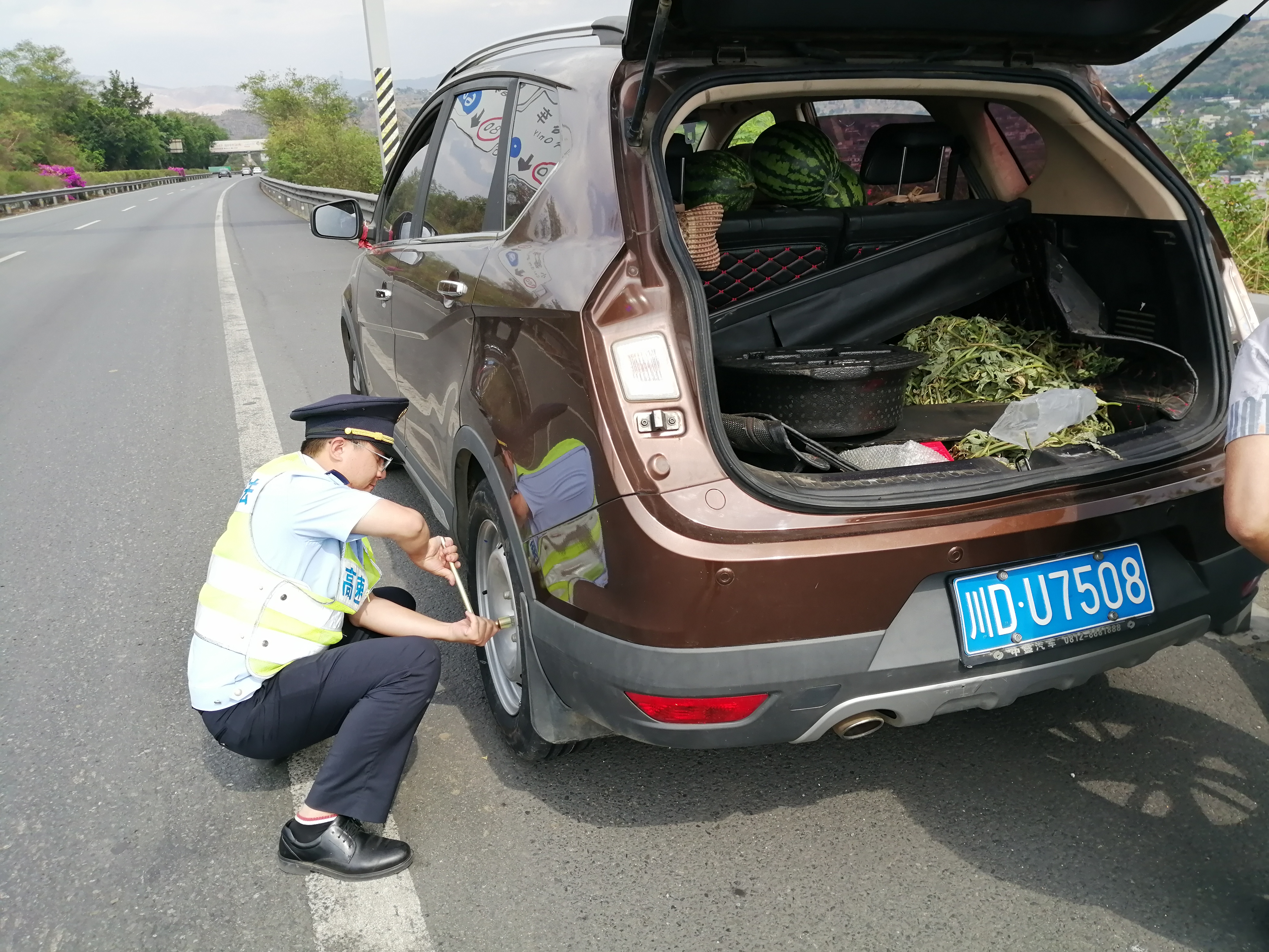 非钒钛度讯(张培峰 记者 吴晓龙 文/图)“我的车胎坏了,可急死我了,麻烦你们帮我一下。”5月2日,G5京昆高速攀田段,一辆小轿车因故障停靠应急停车区,驾乘人员面露难色地向路过的高速执法人员求助道。