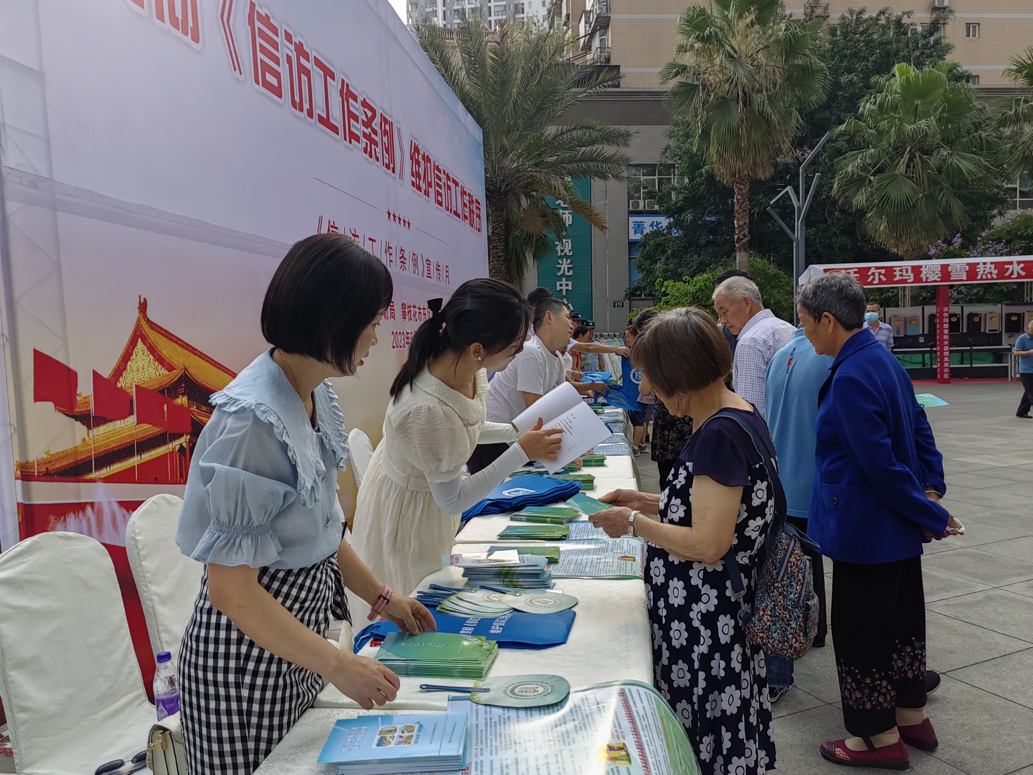信访工作是党的群众工作的重要组成部分,是了解社情民意的重要窗口。2022年5月1日,《信访工作条例》颁布施行,一年来,我市把学习宣传贯彻《信访工作条例》作为重要政治任务,以开展信访工作示范县创建活动为抓手,全力推动《信访工作条例》各项规定落地落实,用心用情为群众排忧解难,信访事项受理办理质效不断提升,有力维护了群众合法权益,促进了社会和谐稳定。图片说明,活动现场,工作人员向过往群众宣传《信访工作条例》。