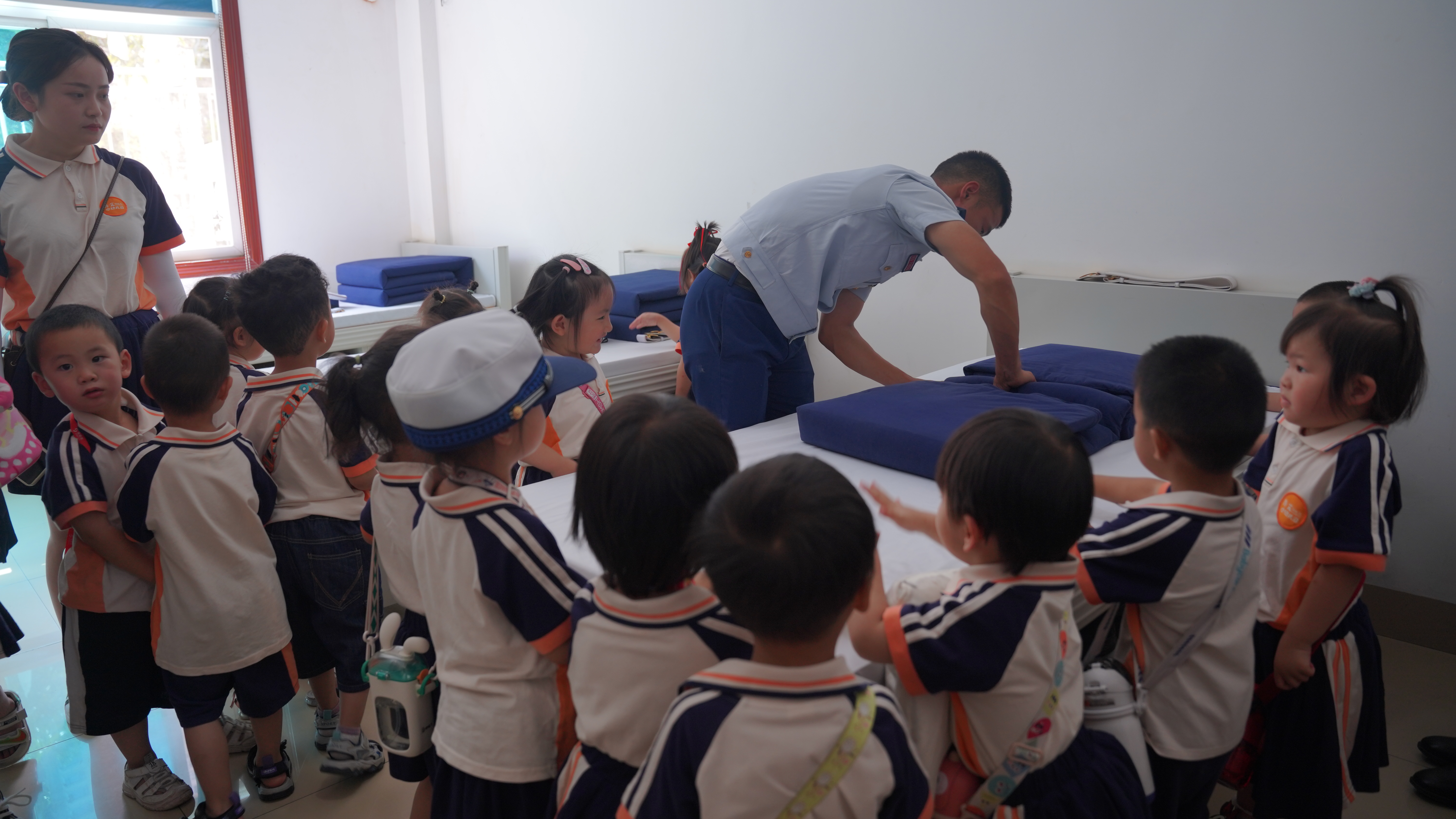 要想进一步了解消防救援生活,还要来到消防员宿舍。在讲解员的带领下,孩子们有序进入班级之中,映入眼帘的是整齐划一的“豆腐块”和干净整洁的环境,而讲解员也有条不紊拿出自己的看家本领,很快一床方方正正的被子就呈现在小朋友面前,房间中瞬间响起了热烈的掌声。