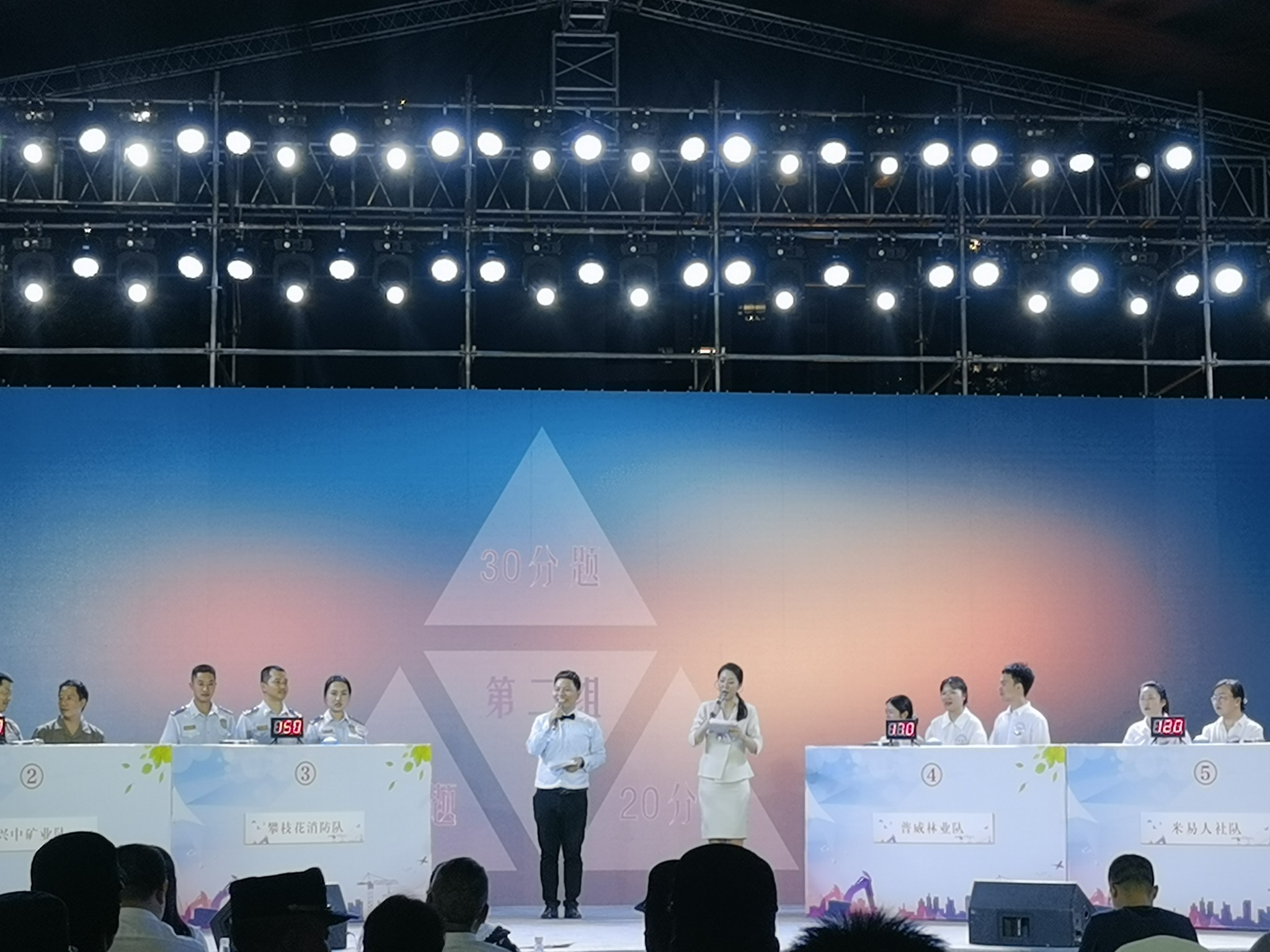 总决赛现场,攀枝花消防队、普威林业队、兴中矿业队、中国十九冶队、米易人社队、丰源矿业队共6支队伍18名优秀选手面对必答题、抢答题、名次争夺题等环节,冷静思考、沉着应对、密切配合,上演了一场精彩的脑力与知识的较量,展现出了积极向上的比赛作风。参赛选手展开激烈角逐之余,活动还为现场观众进行了有奖竞猜环节和回答问题环节,大家参与感十足,众多网友也通过线上互动抽奖积极参与活动。