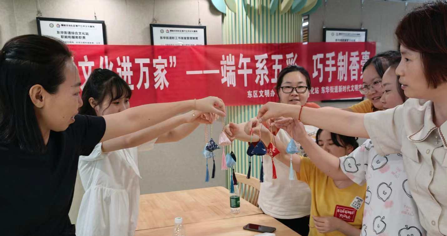 经过努力,大家手中一个个五彩精致实用的香囊就展现了出来。“香囊承载着民俗传统文化,也是端午节的重要习俗。今天我亲手缝制了香囊,自然环保,美观又驱蚊,很有纪念意义。”居民沈静说。