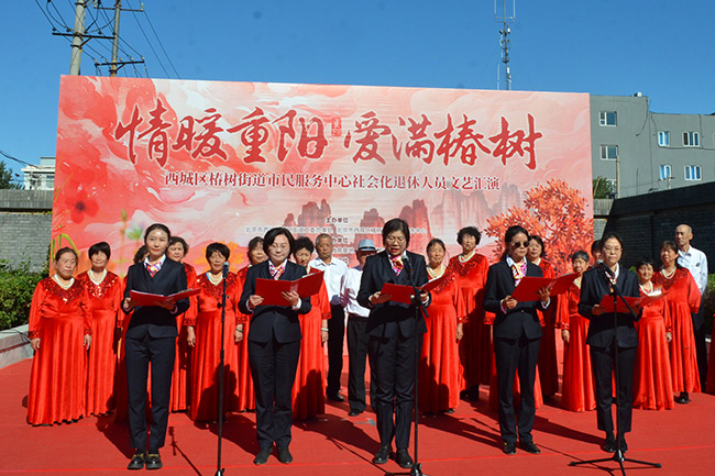 在九九重阳节到来之际,为弘扬中华民族尊老、爱老、敬老、助老的传统美德,丰富广大老年朋友们的文化生活,10月20日,由西城区椿树街道工委办事处、椿树街道市民服务中心联合主办的“情暖重阳、爱满椿树”重阳节主题汇演活动在北京市林则徐禁毒教育基地(福州新馆)举办,活动组织辖区的社会化退休人员观看并亲自参与演出,大家欢聚一堂,用丰富多彩的节目共度重阳佳节。