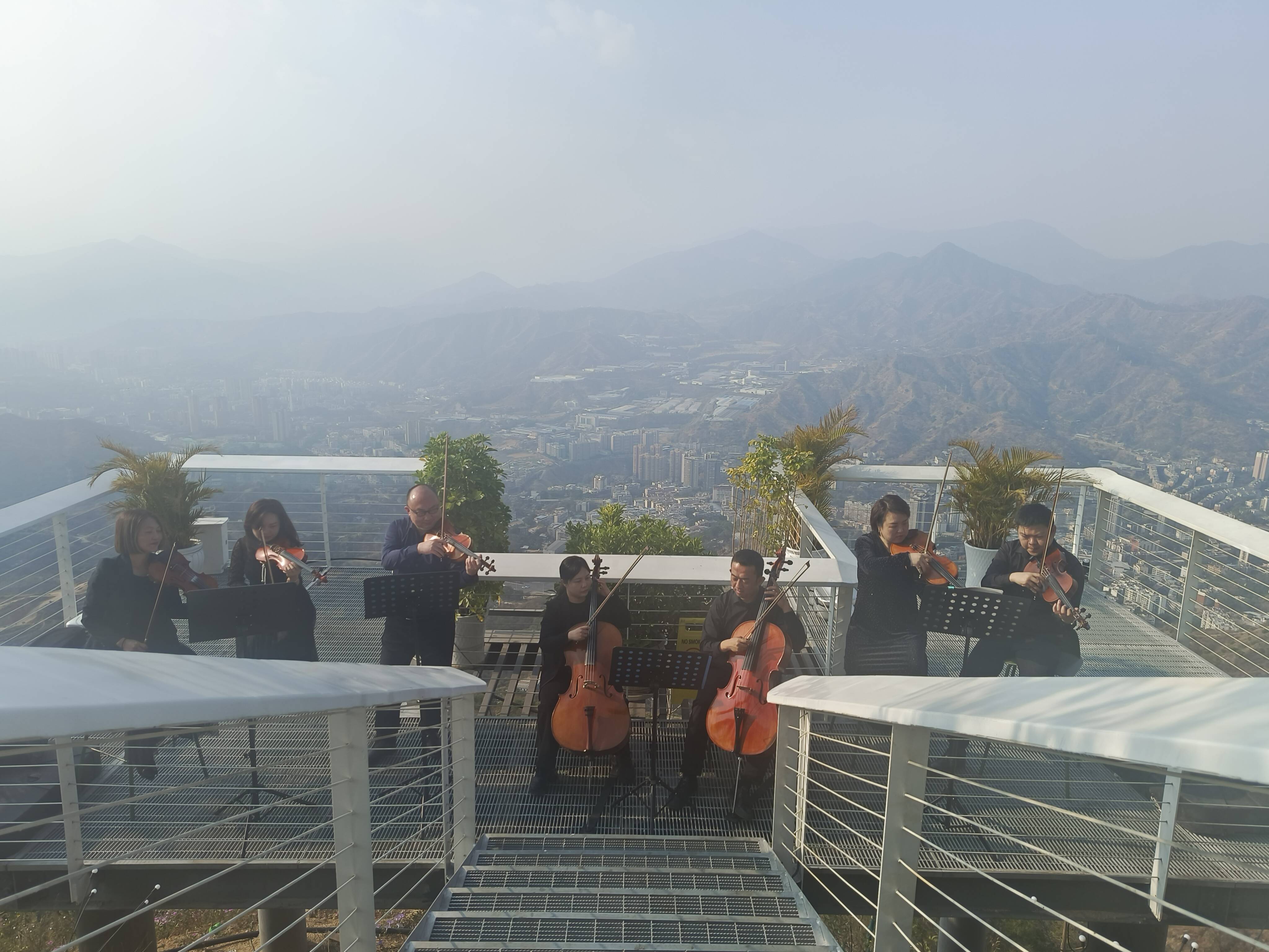 上午,随着登山游客的聚集,市直机关“喜庆元宵”迷你音乐会开始,市文化艺术中心的7位演职人员带来《莫扎特弦乐小夜曲第一乐章》《新春乐》《菊花台》等弦乐重奏曲目。在山顶独特的城市美景中聆听婉转悠扬的旋律,令人沉醉。