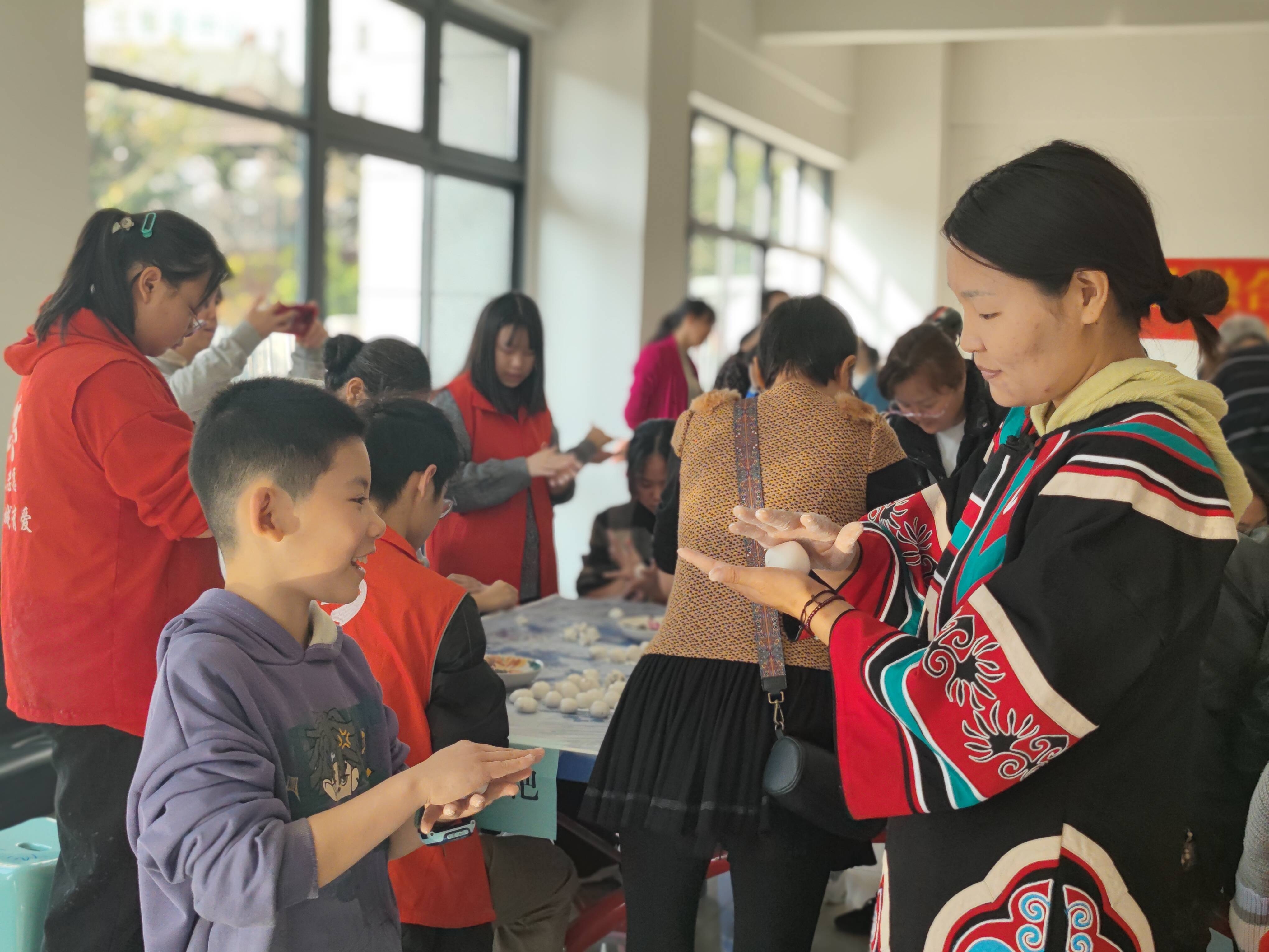 社区工作人员还精心准备了居民喜欢的剪纸、彩泥、谜语等,大家争先恐后的看谜面猜谜语、剪彩纸、捏彩泥,现场热闹非凡。其间,志愿者为大家端来了煮好的汤圆、饺子、荞粑粑,大家吃在嘴里,暖在心里,感受带了中国传统节日的味道。