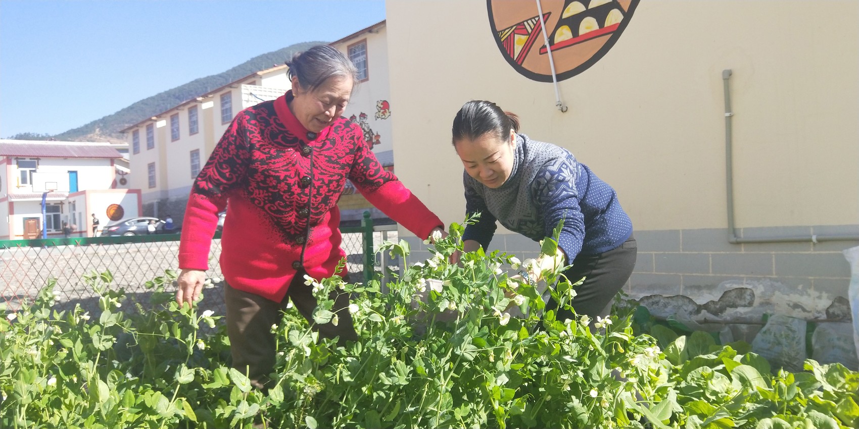 刘骥(右)和母亲一道驻村,种植蔬菜改善工作队生活。凉山州委组织部供图